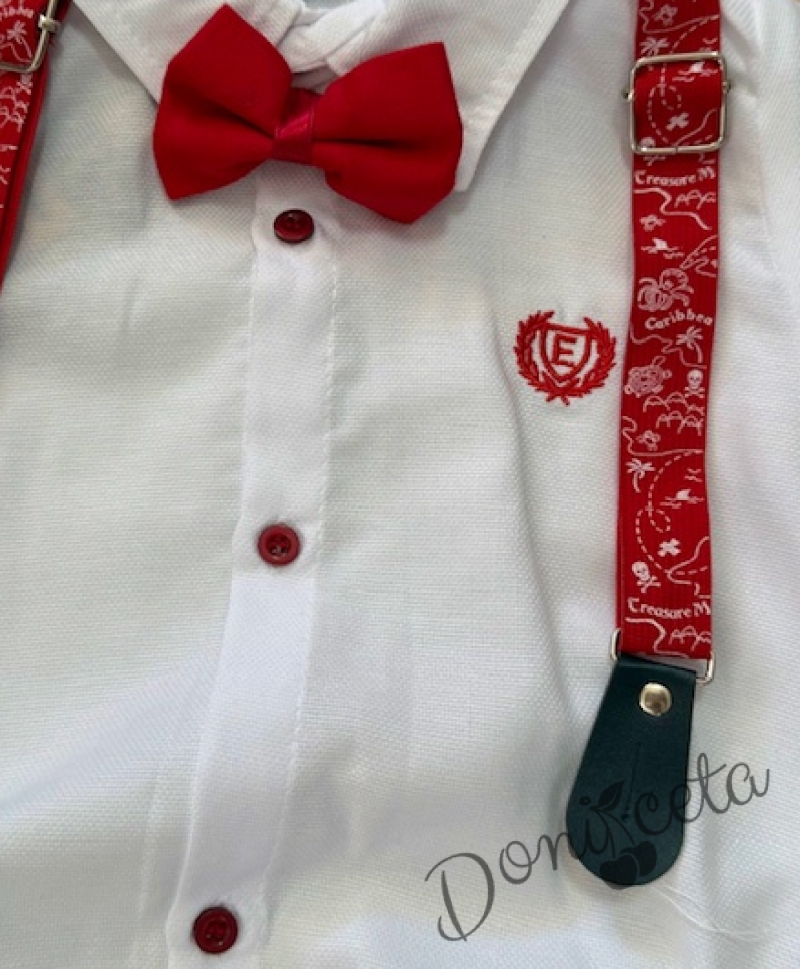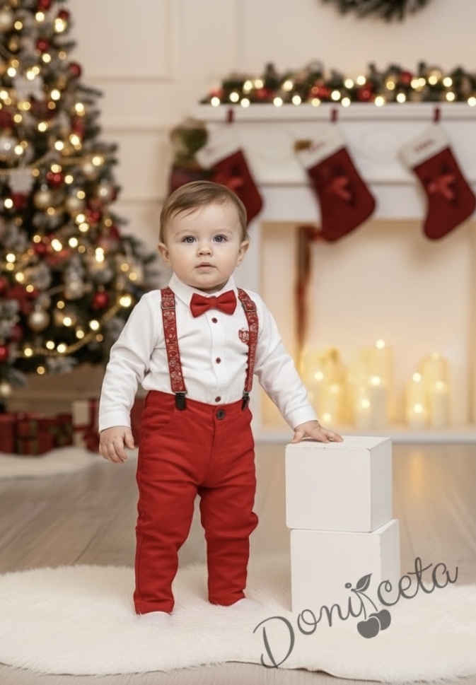 Бебешки комплект от панталон в червено, риза в бяло, тиранти и папийонка от колекция Червеника