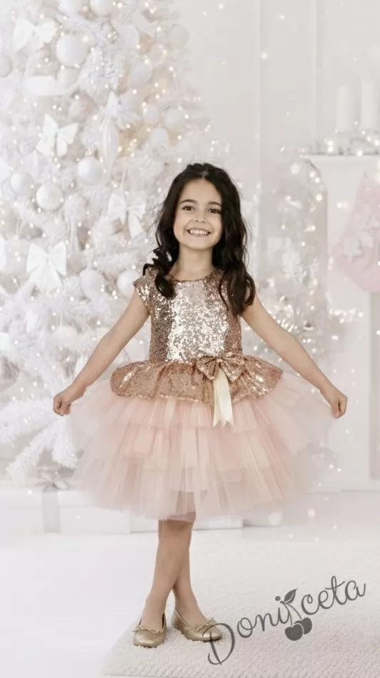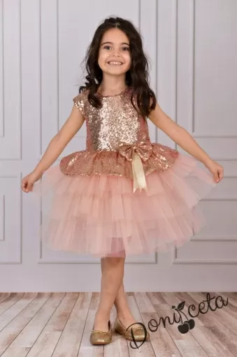 Детска официална рокля в прасковено от пайети с тюл на пластове Валериа
