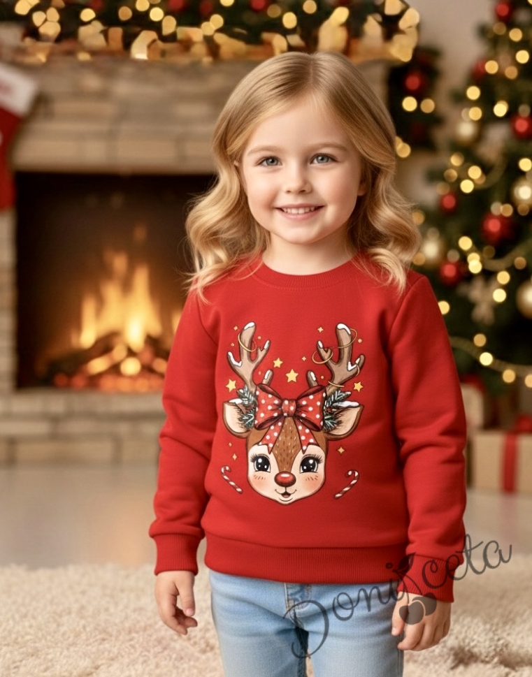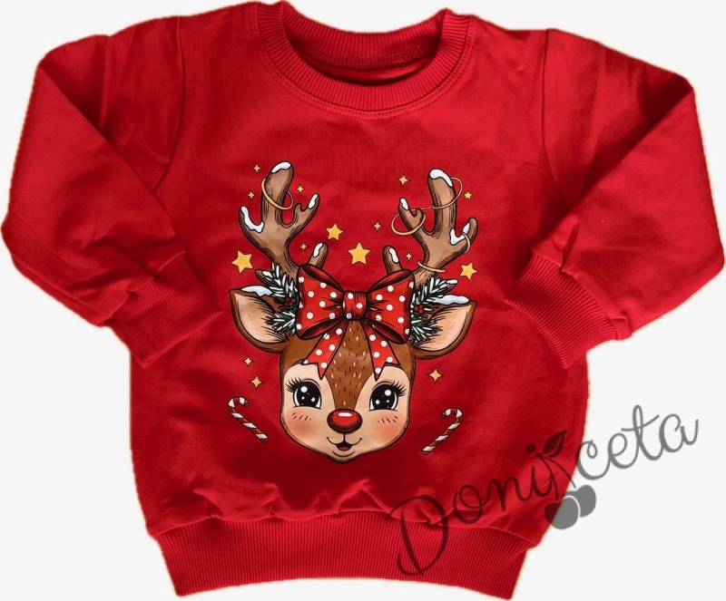 Детска/бебешка ватирана коледна блузка в червено с еленче с шалче