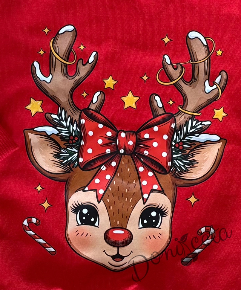 Коледен детски комплект за момиче в червено от блузка и панталонче с къдрички и еленче