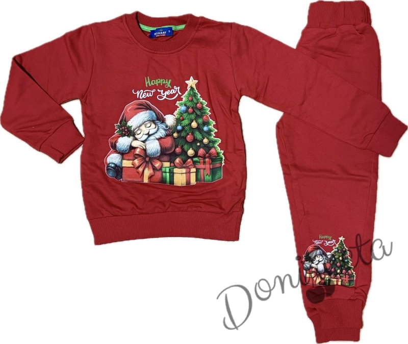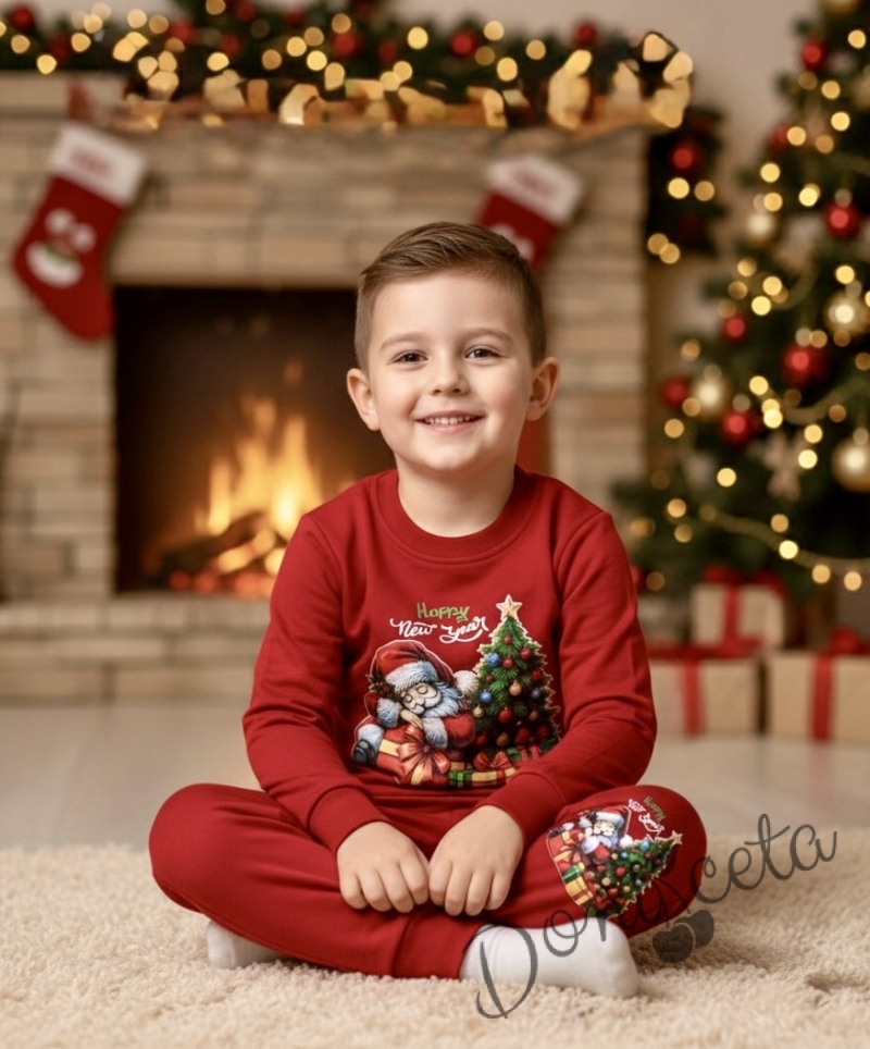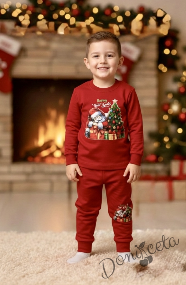 Ватиран коледен комплект в червено с картинка на Дядо Коледа с елха и надпис