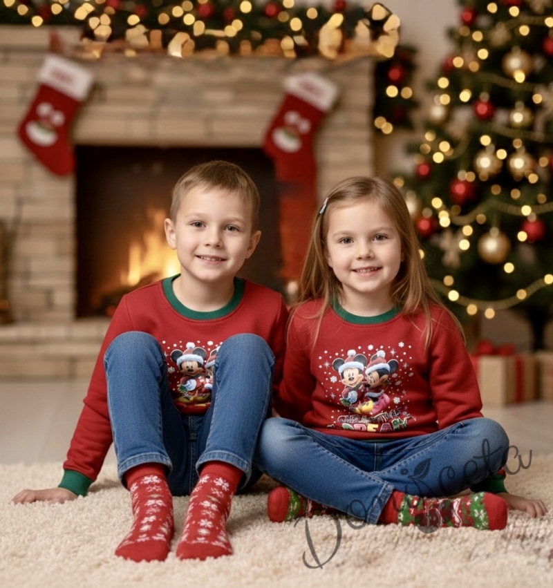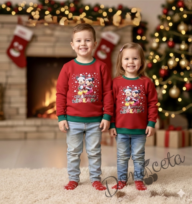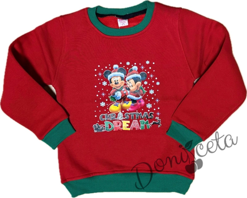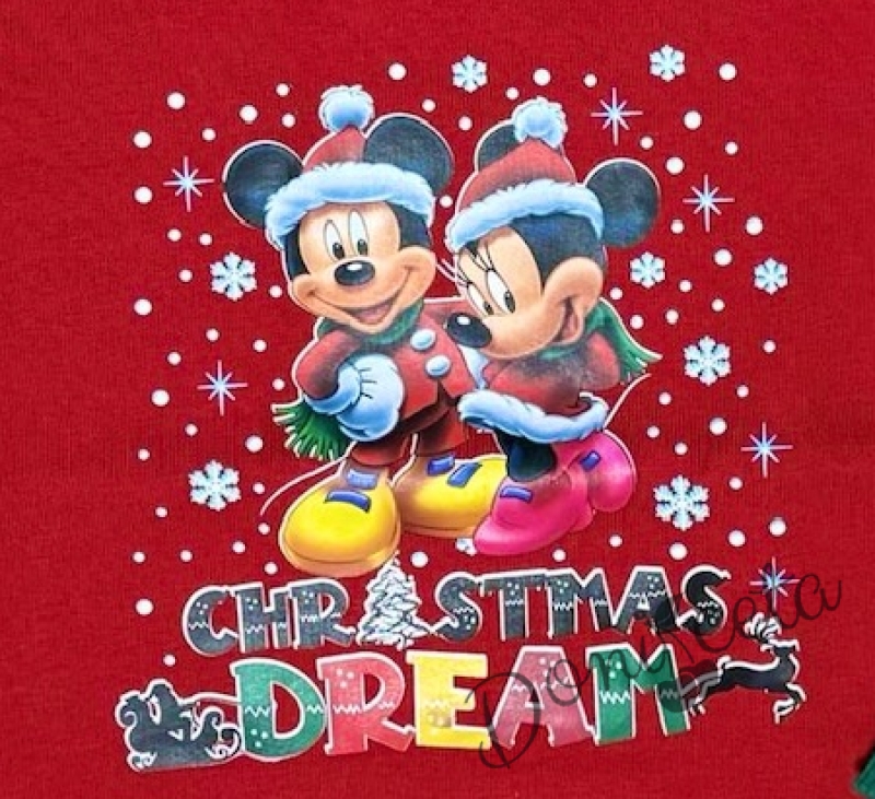 Коледна ватирана блуза за момиче в червено с дълъг ръкав с коледни мотиви с Мини и Мики