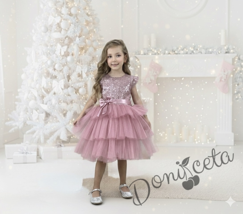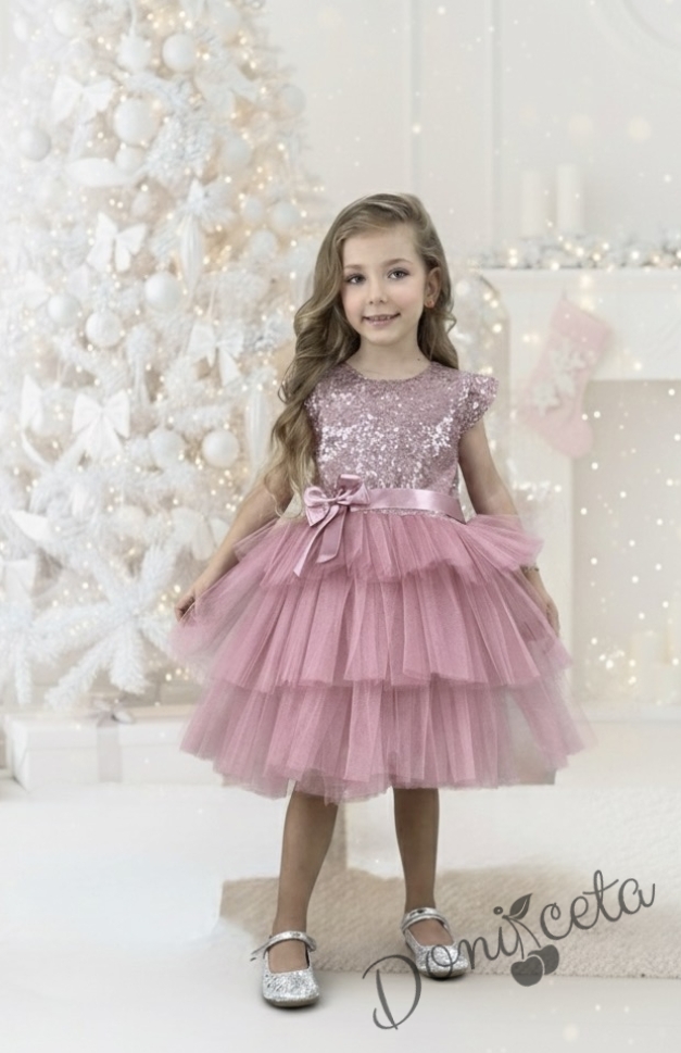 Празнична официална рокля момиче Хава в пепел от рози от пайети и тюл на 3 пласта и панделка