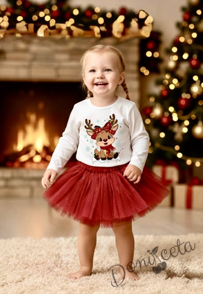 Комплект за момиче от 2 части-пола от бляскъв тюл в червено и блуза с дълъг ръкав в бяло с еленче с панделка