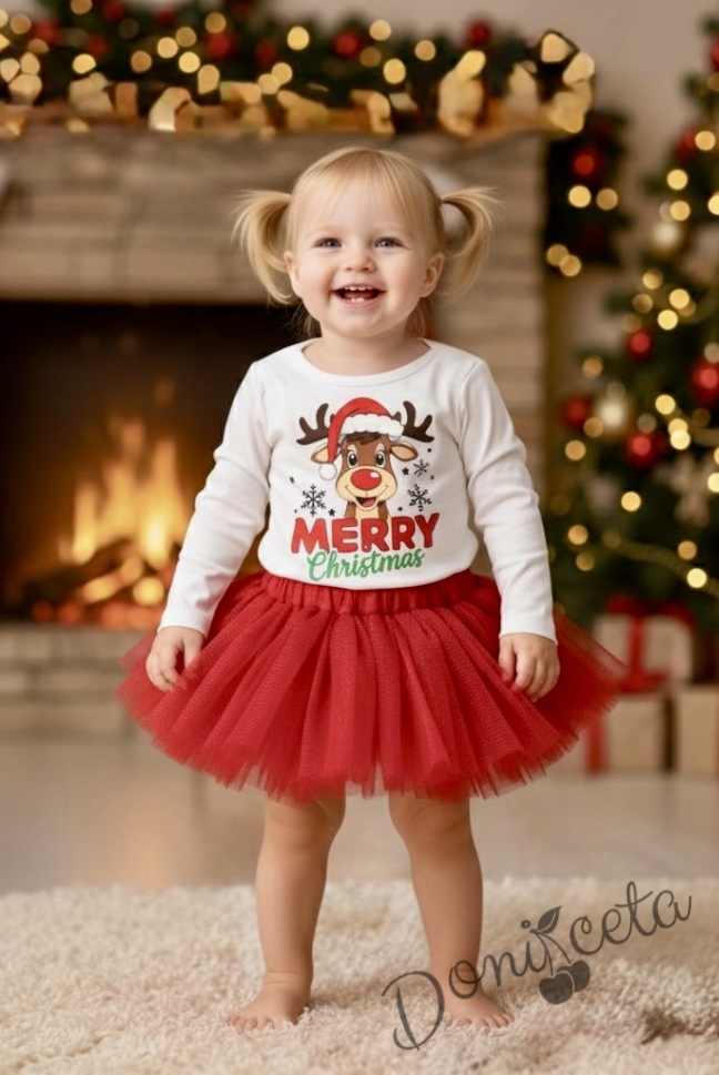 Комплект за момиче от 2 части-пола от бляскъв тюл в червено и блуза с дълъг ръкав в бяло с еленче и надпис