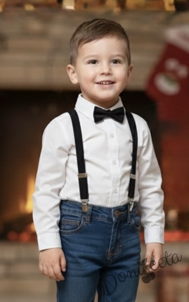 Официална детска риза с дълъг ръкав в бяло с папийонка и тиранти в черно
