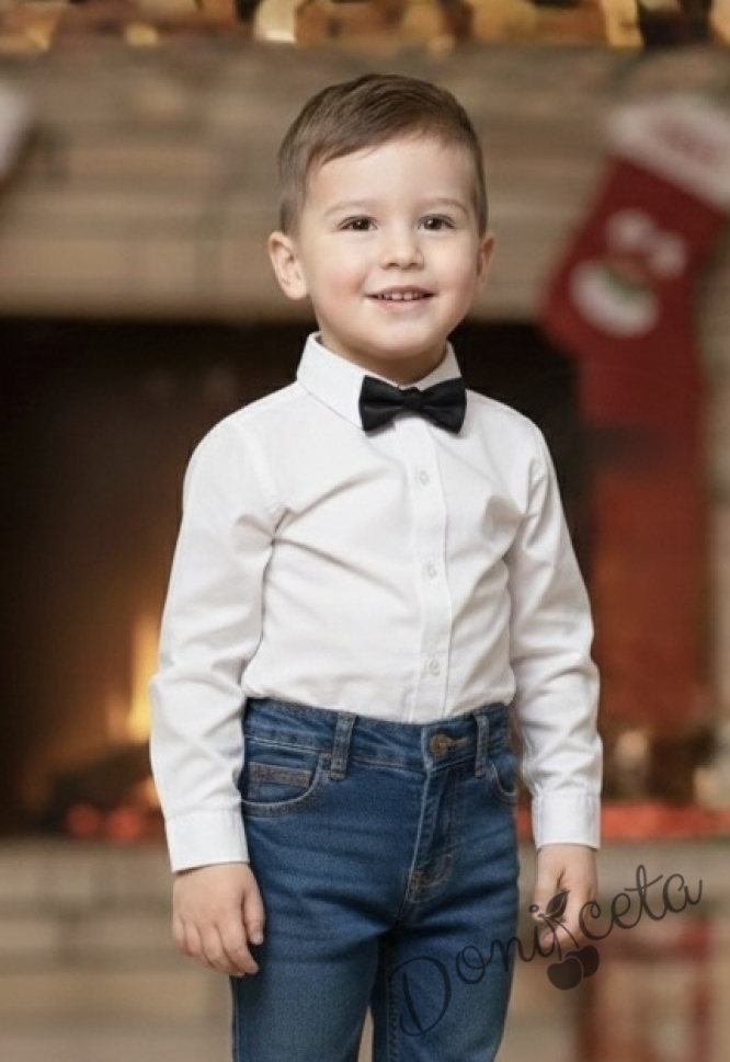 Представяме ви тази елегантна детска риза за момче в класически бял цвят, идеална за всеки официален повод или за да придадете стил на ежедневното облекло. Тази риза е с черна папионка, която добавя нотка изтънченост и прави визията завършена.