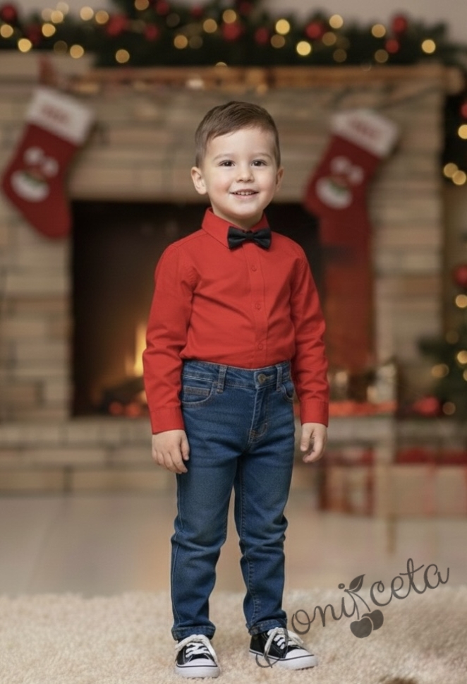 Представяме ви тази елегантна детска риза за момче в класически червен цвят, идеална за всеки официален повод или за да придадете стил на ежедневното облекло. Тази риза е с черна папионка, която добавя нотка изтънченост и прави визията завършена.