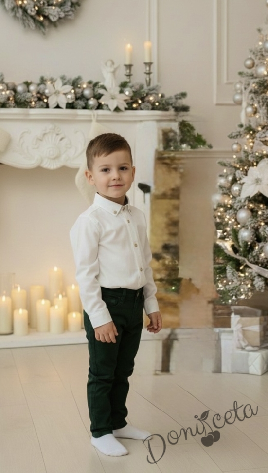 Коледен комплект за момче от 2 части-риза в бяло с яка в бяло и панталон в зелено