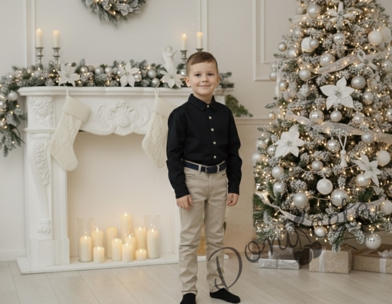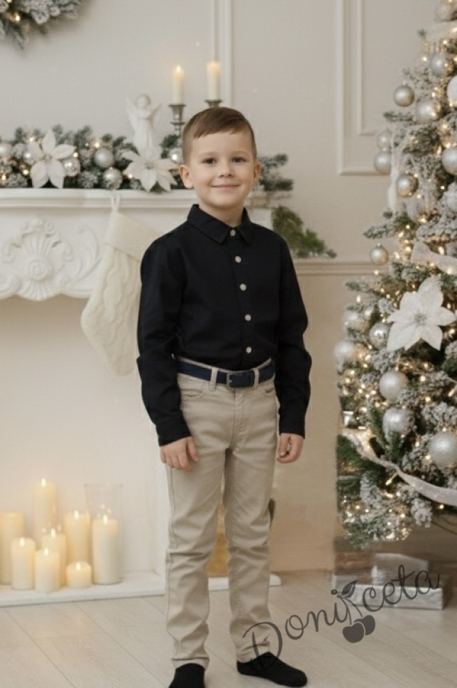 Детски комплект от риза с дълъг ръкав в черно и дълъг панталон в бежово от колекция Черновина с колан в черно