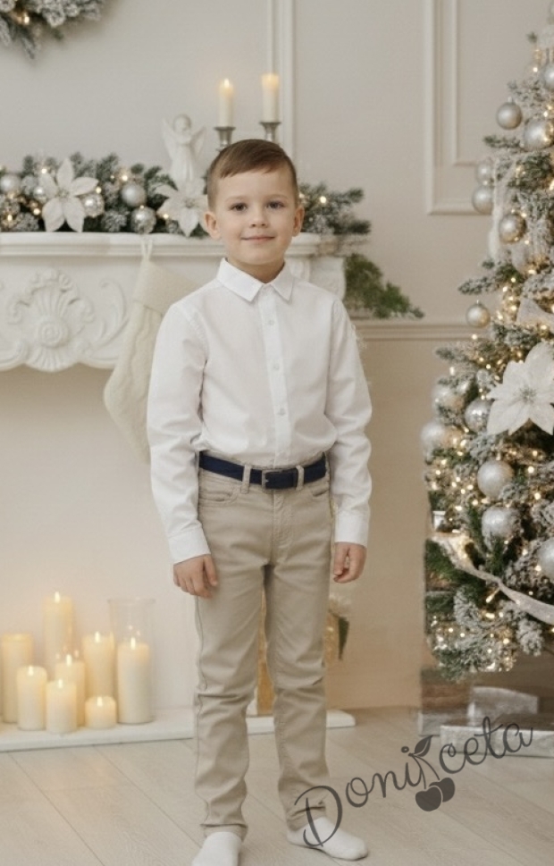 Комплект за момче от 3 части - тениска и риза в бяло и панталон в бежово