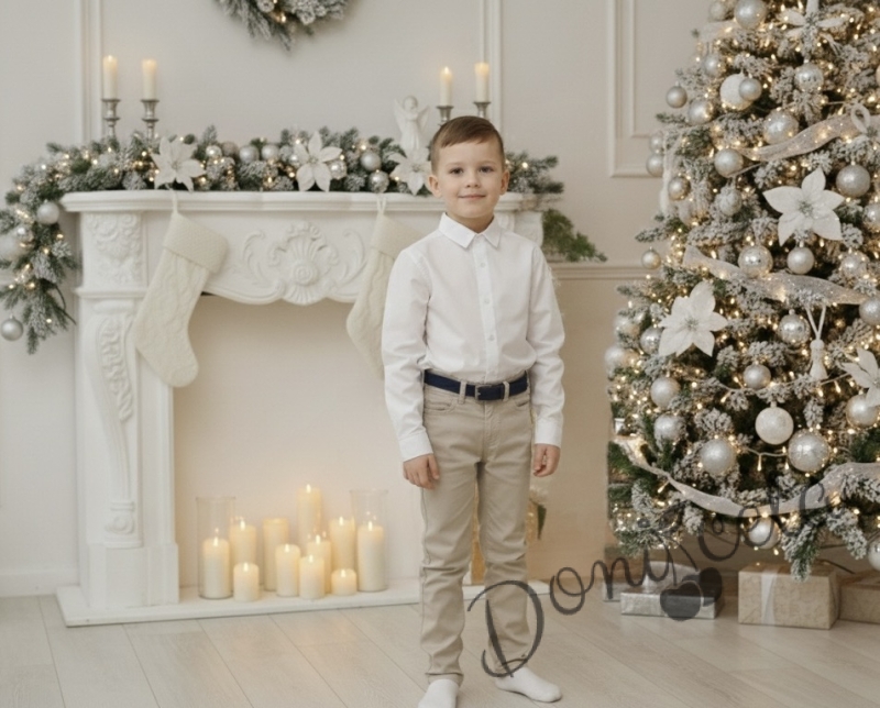 Детски комплект от риза с дълъг ръкав в бяло и дълъг панталон в бежово