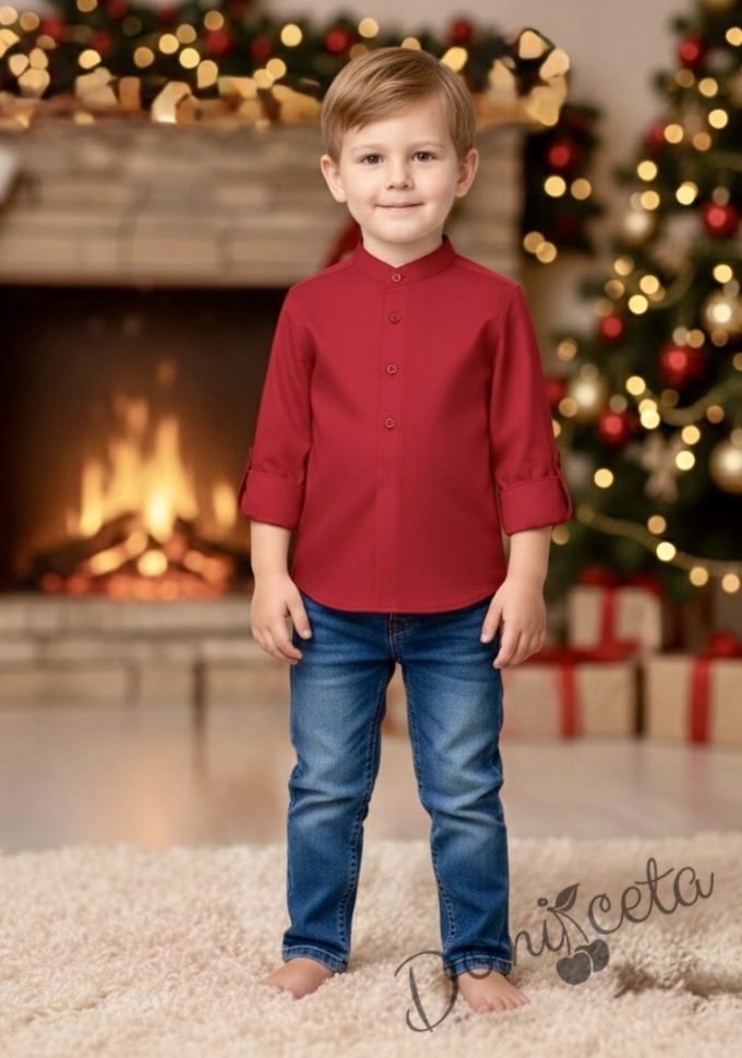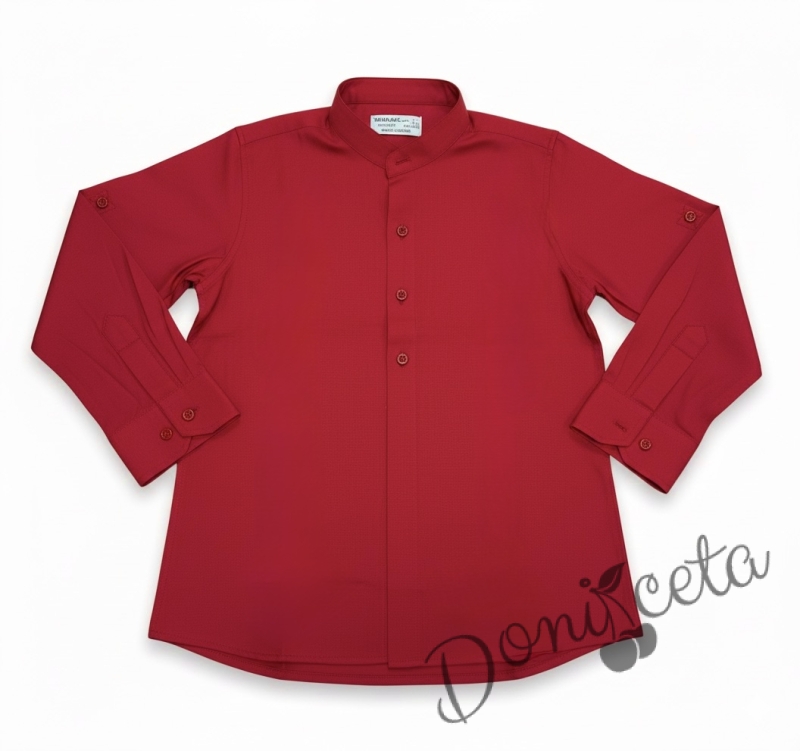 - Официална детска риза с дълъг ръкав за момче в червено без яка.