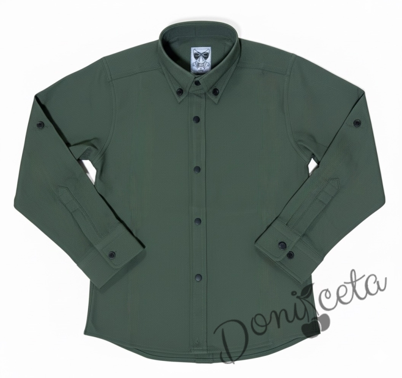 - Детска риза за момче в тъмнозелено с яка и черни копчета.