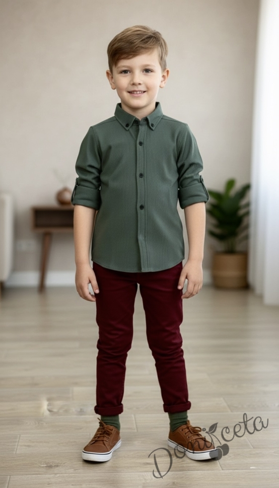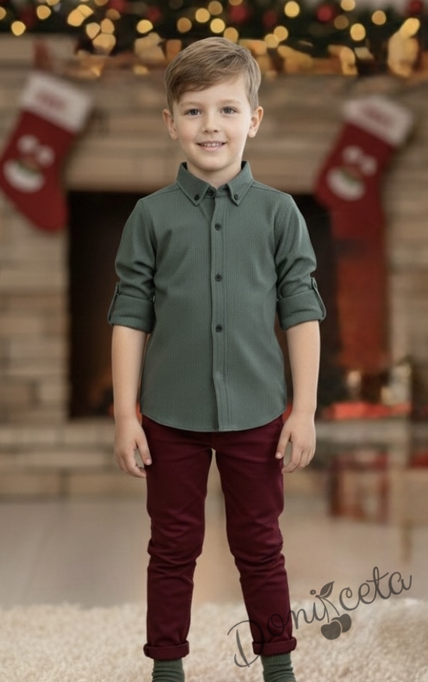 Комплект за момче от 2 части-риза в зелено с яка и панталон в бордо