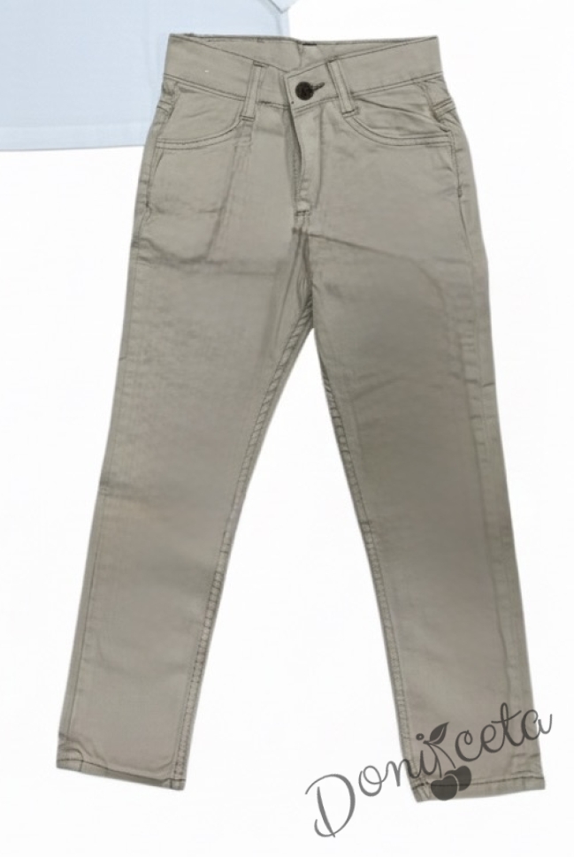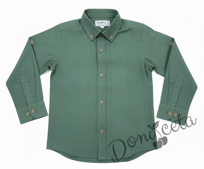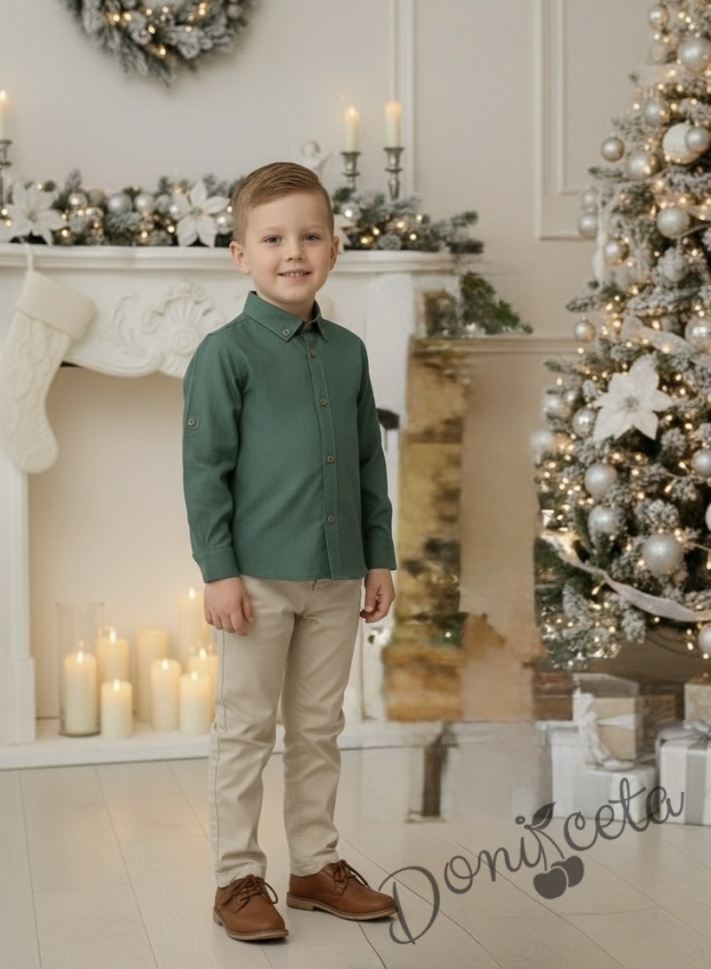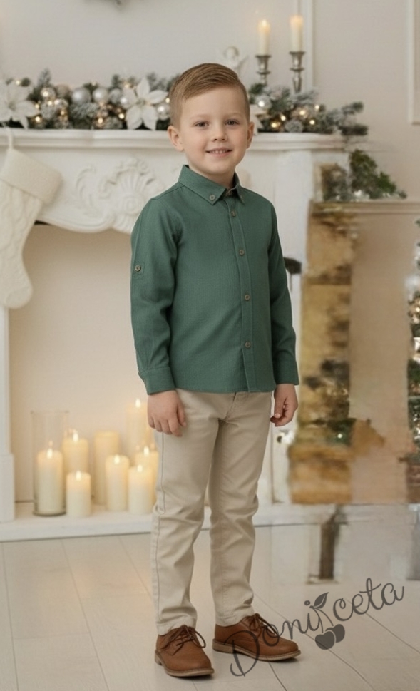 Представяме Ви нашия елегантен и стилен празничен комплект за момче от 2 части- риза в зелено с яка и панталони в бежово.