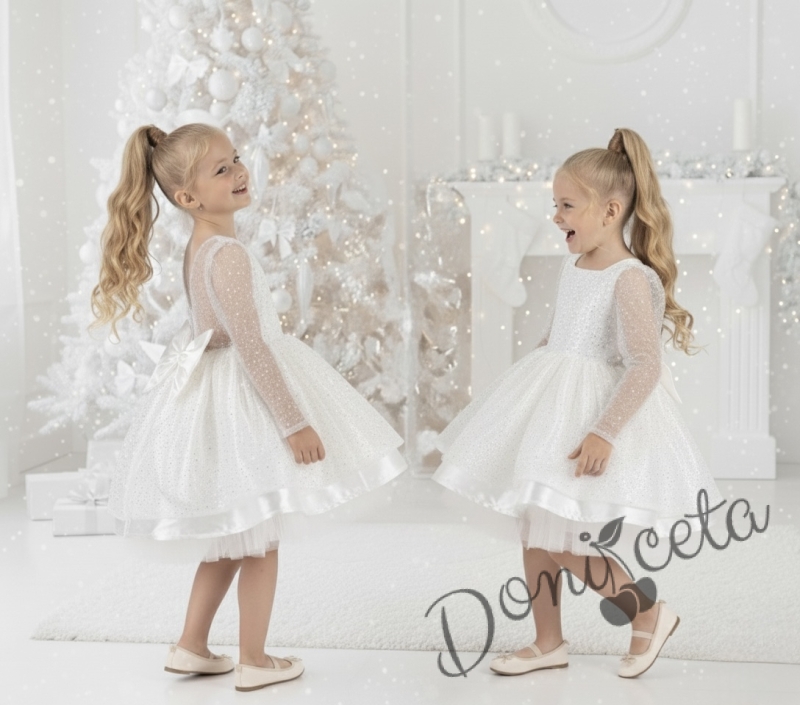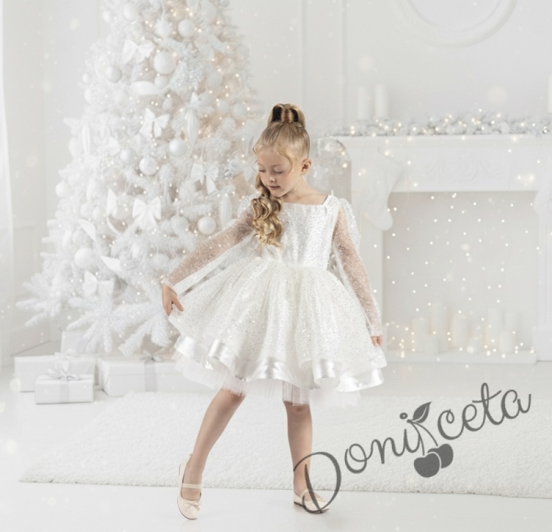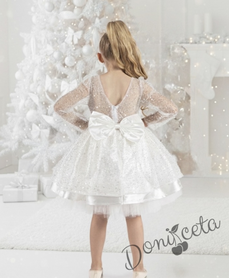 - Оригинална детска рокля с дълъг ръкав в бяло с пайети.