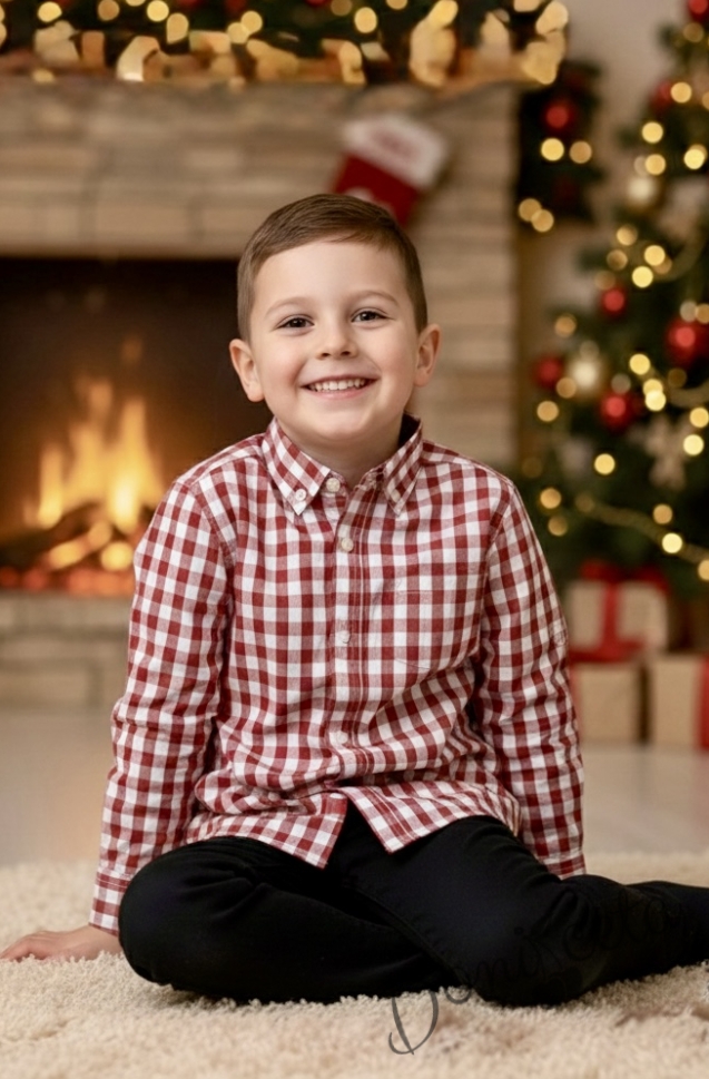 Представяме Ви нашия елегантен и стилен празничен комплект за момче от 2 части- риза в червено на квадратчета и панталони в черно.