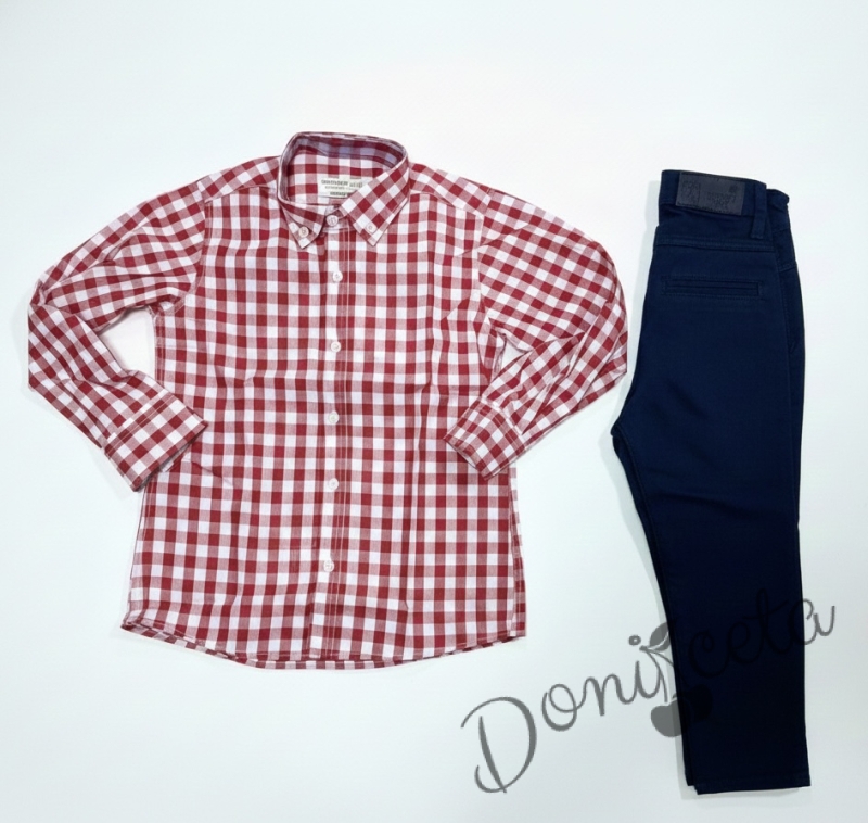 Детски комплект за момче от 2 части-риза в червено на квадратчета и панталон в черно