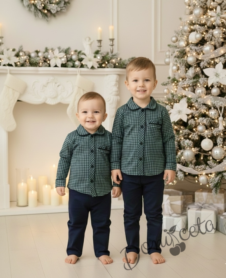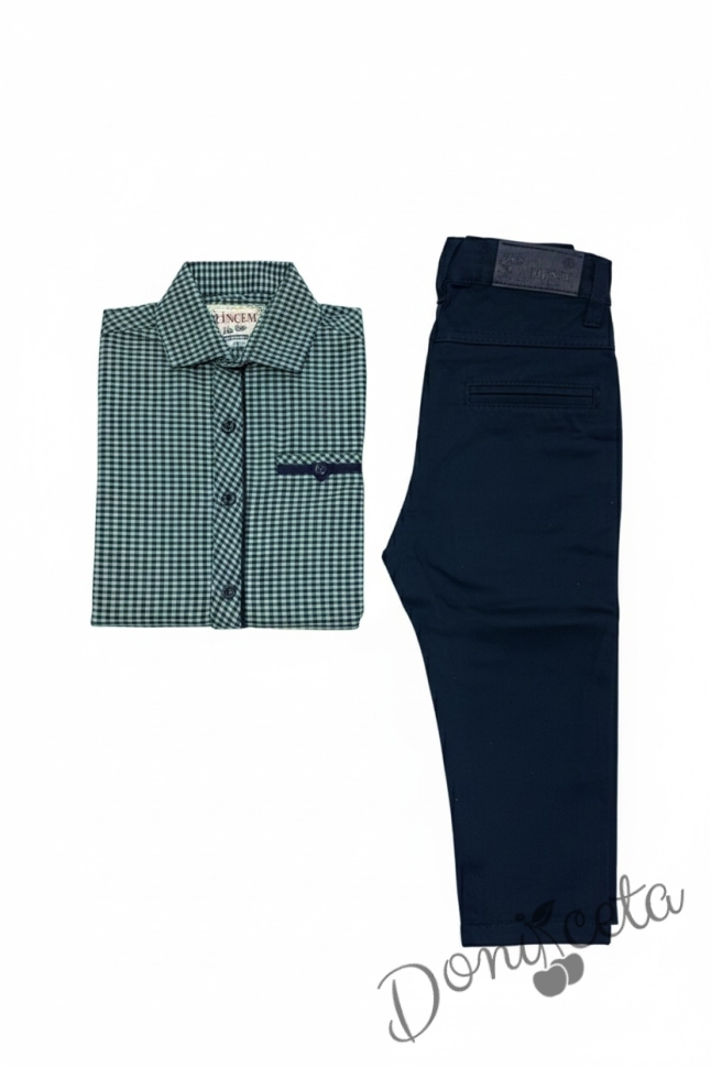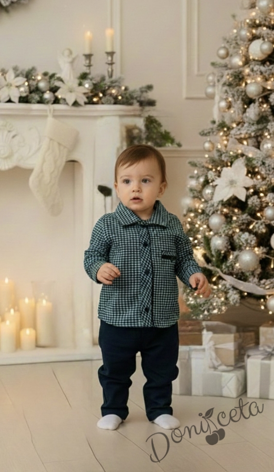 Детски комплект за момче от 2 части-риза в зелено на квадратчета и панталон в тъмносиньо