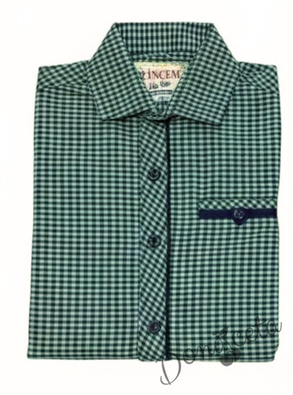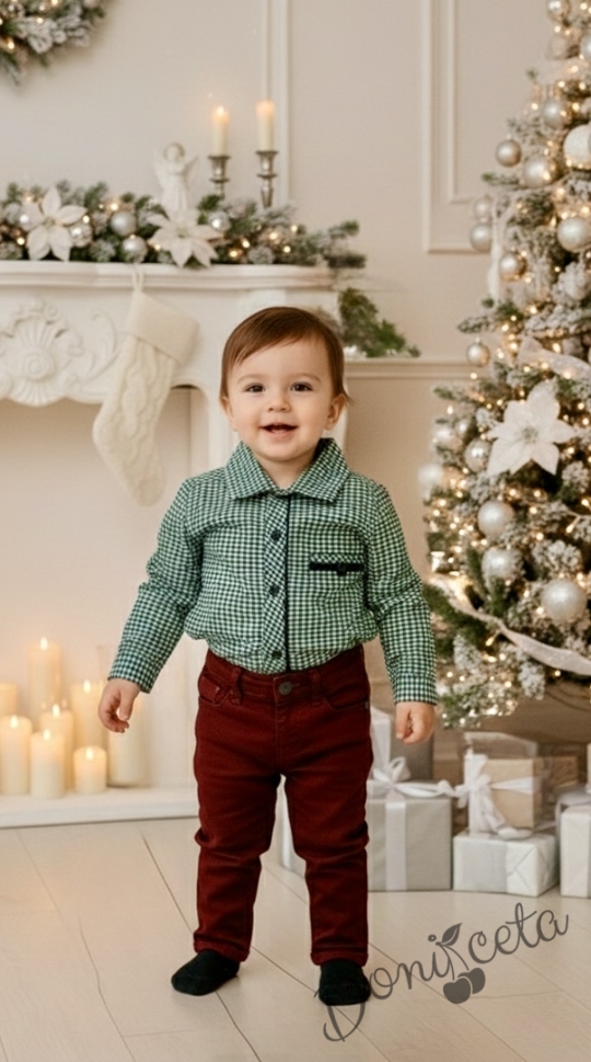 Представяме Ви нашия елегантен и стилен празничен комплект за момче от 2 части- риза в зелено на квадратчета и панталон в бордо.