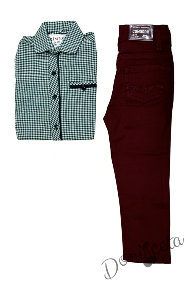 Детски комплект за момче от 2 части-риза в зелено на квадратчета и панталон в бордо