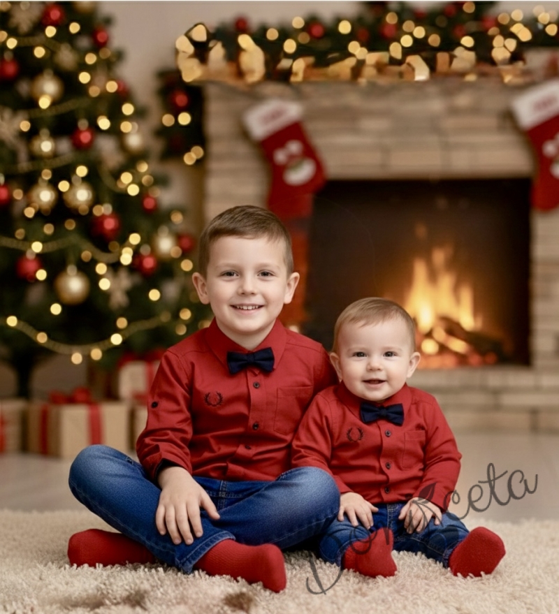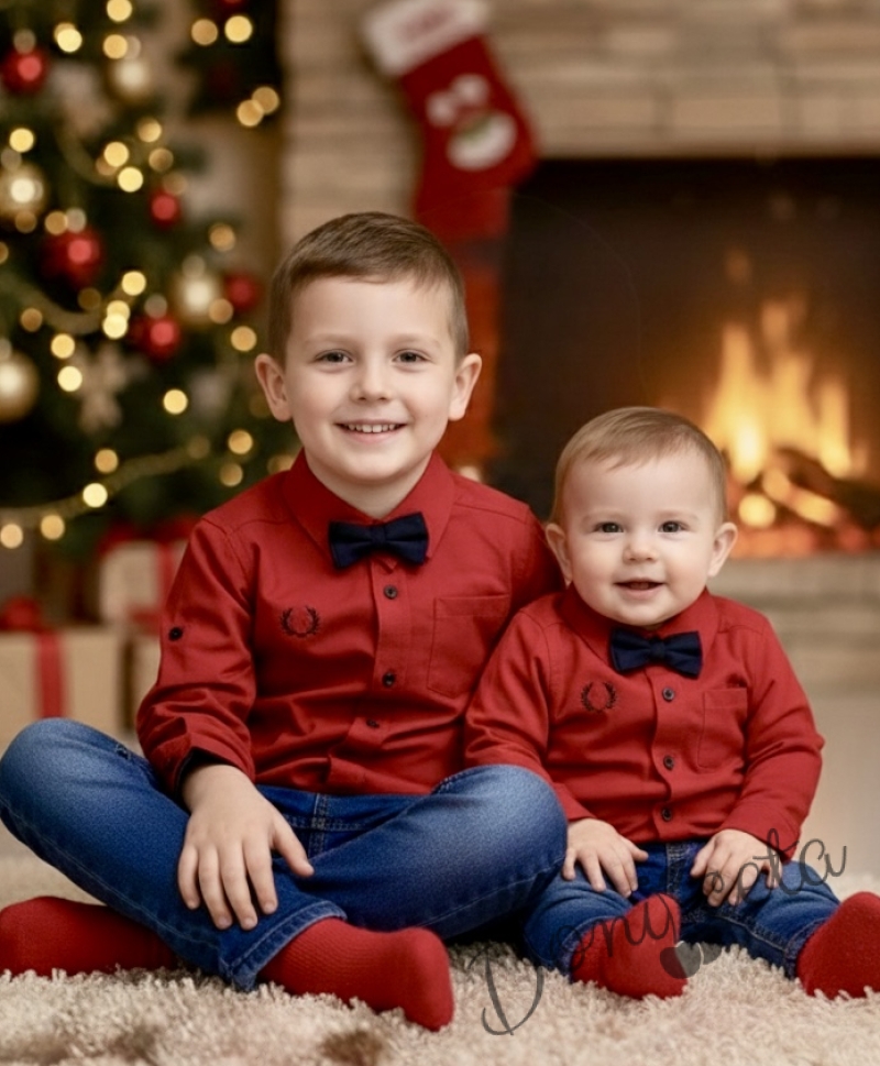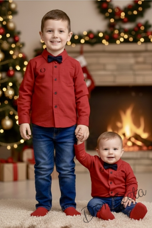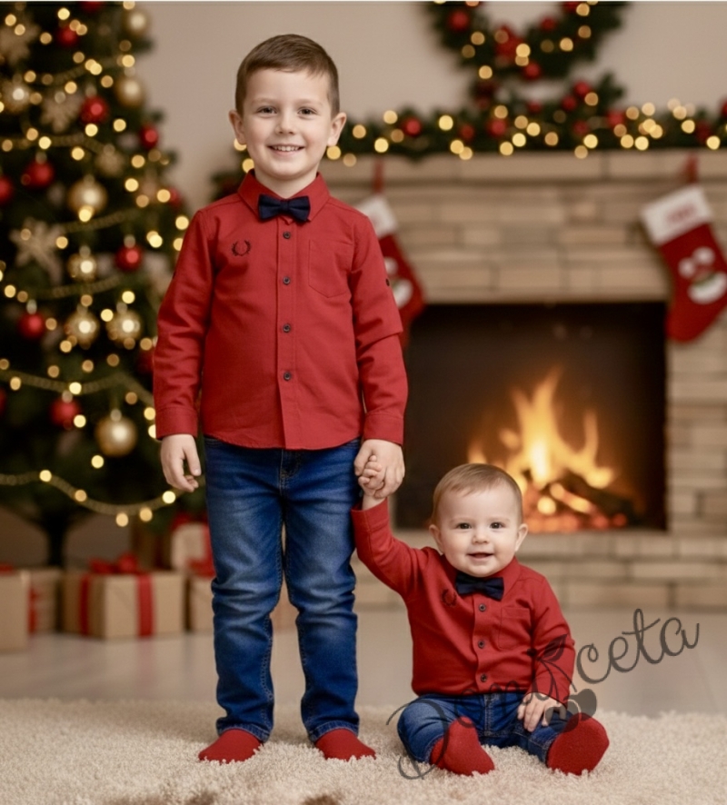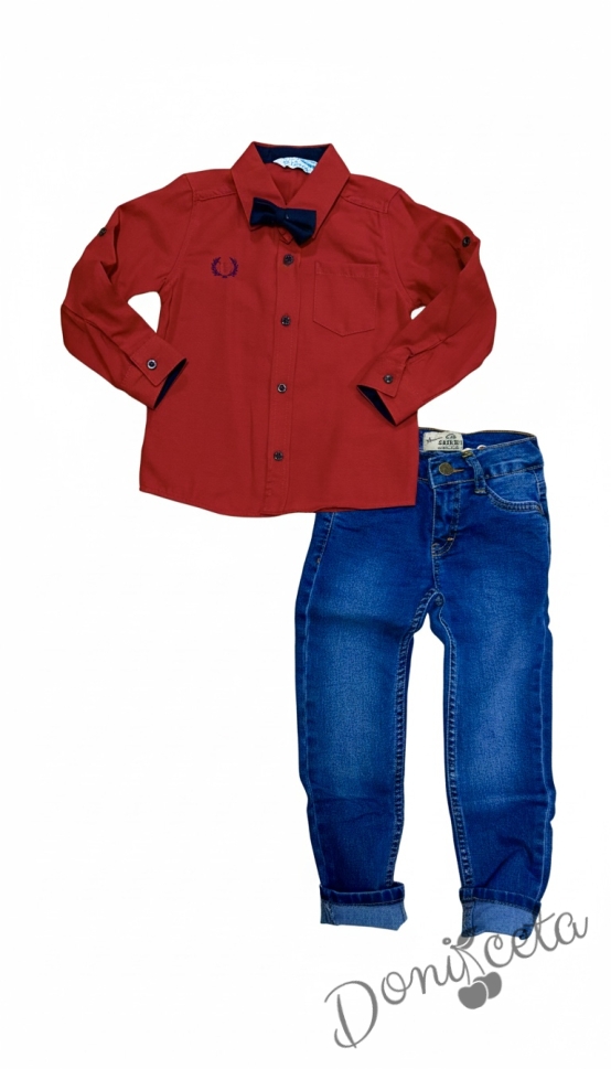 Комплект от риза в червено с папийонка в тъмносиньо и дънки