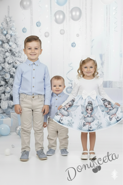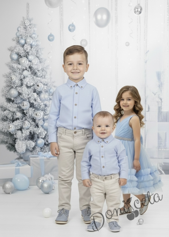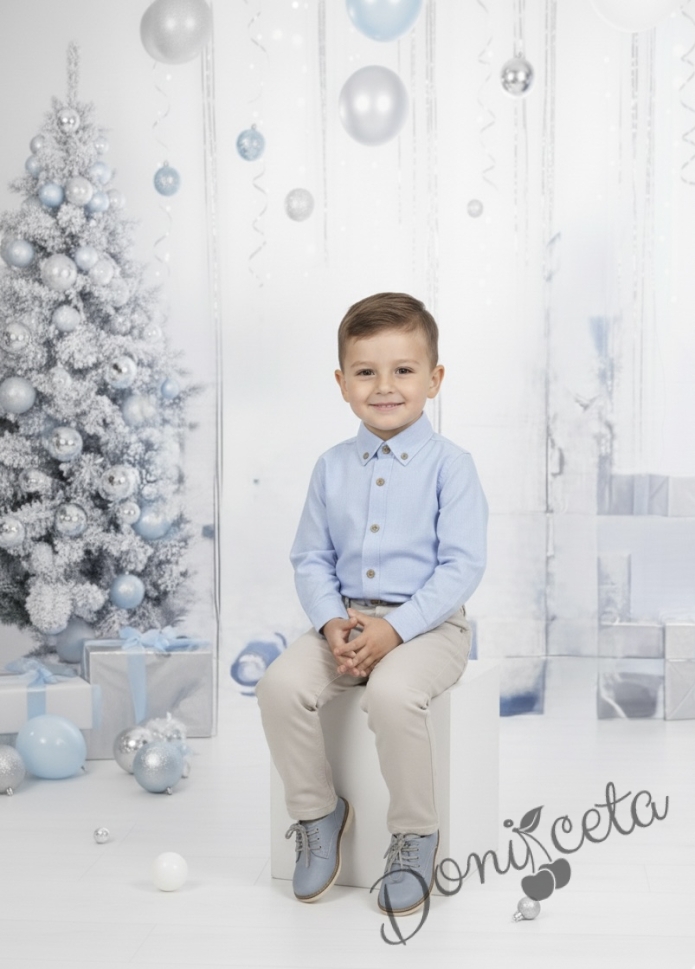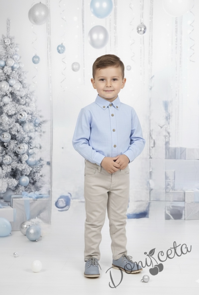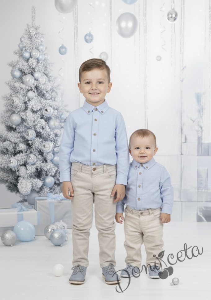 Детски комплект за момче от 2 части-риза в светлосиньо с яка и копчета в бежово и панталон в бежово Светлосияна