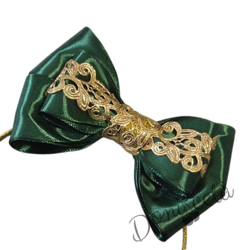 Официална детска коледна рокля от богат тюл и сатен без ръкав в тъмнозелено с голяма златиста панделка и фиба за коса Сесилия