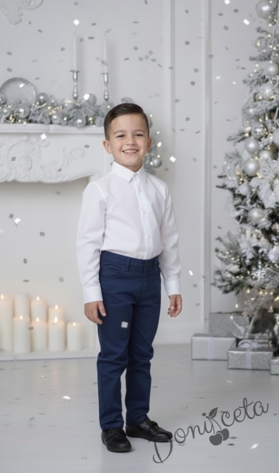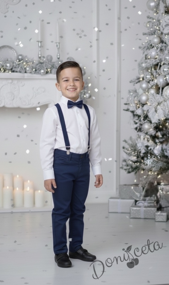 Представяме Ви нашия елегантен и стилен празничен комплект за момче от 2 части-риза в бяло с яка и панталони и тиранти с папийонка в тъмносиньо