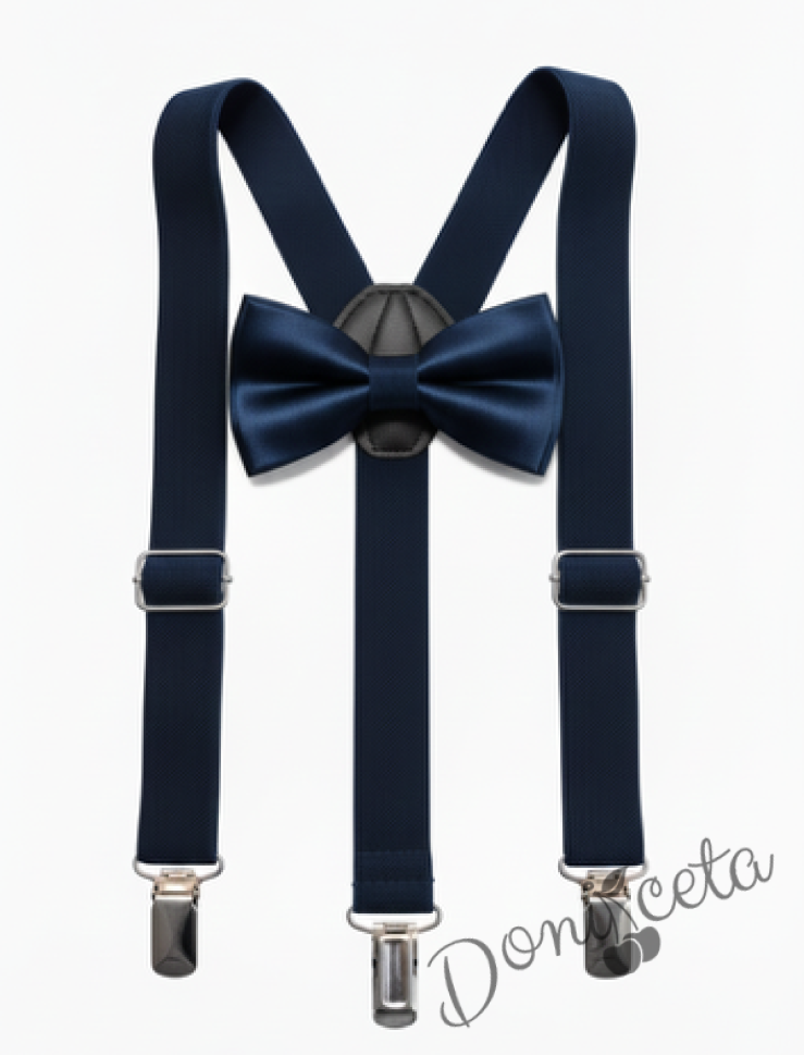 Детски комплект за момче от 2 части-риза в бяло с яка, панталон в бяло и тиранти с папийонка в тъмносиньо