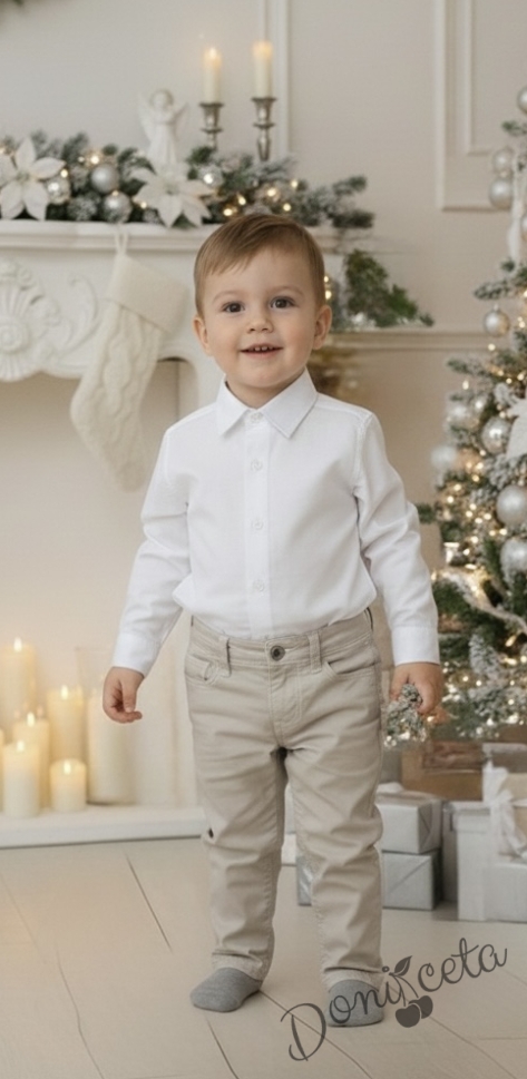 Представяме Ви нашия елегантен и стилен празничен комплект за момче от 2 части- риза в бяло с яка и панталон в бежово.