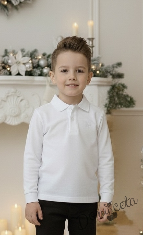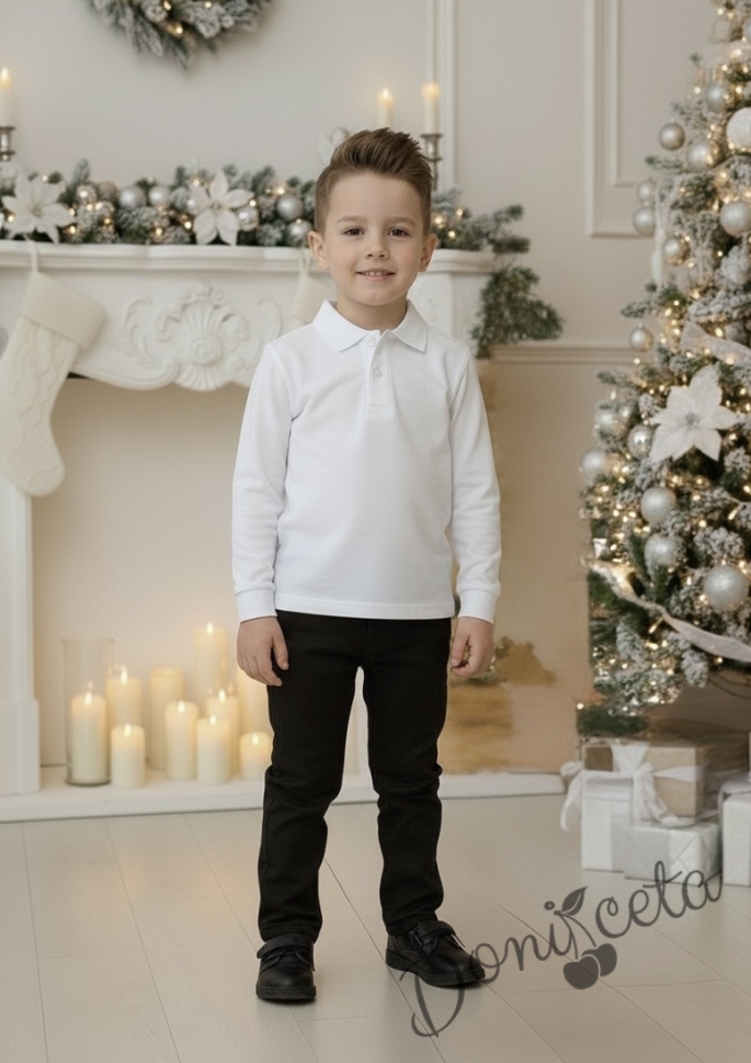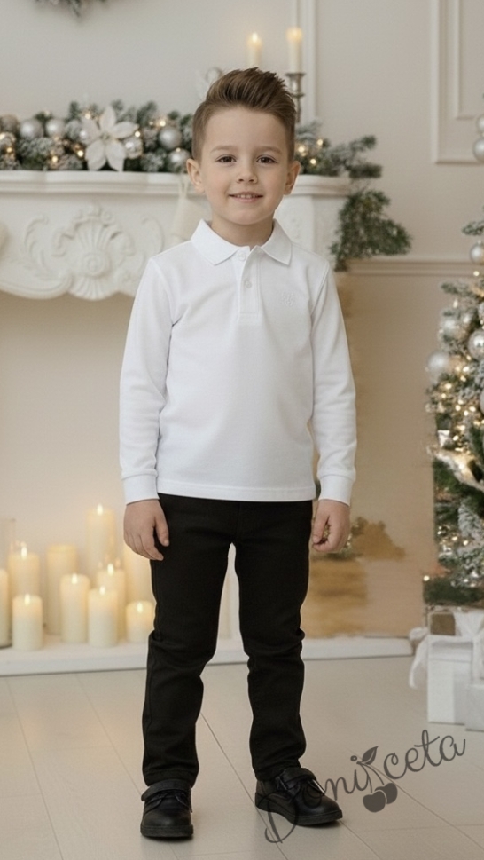 Представяме Ви нашия елегантен и стилен празничен ии ежедневен комплект за момче от 2 части-блуза с якичка в бяло и панталон в черно.