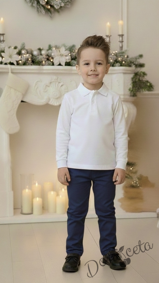 Представяме Ви нашия елегантен и стилен празничен ии ежедневен комплект за момче от 2 части-блуза с якичка в бяло и панталон в тъмносиньо.