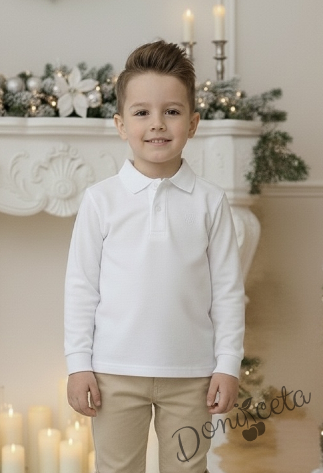 Представяме Ви нашия елегантен и стилен празничен ии ежедневен комплект за момче от 2 части-блуза с якичка в бяло и панталон в бежово.