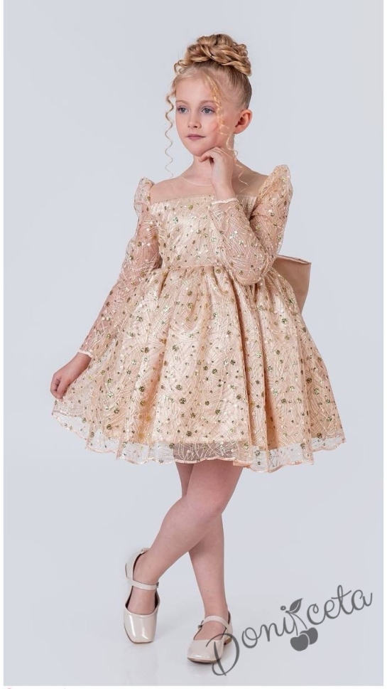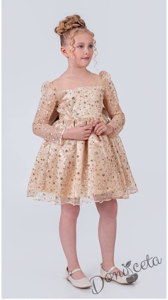 Официална детска рокля в златисто с блясък с дълъг ръкав Естелка
