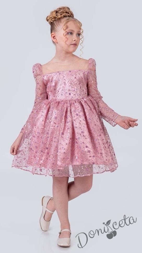 Начало МОМИЧЕТА Официална детска рокля в пепел от рози с блясък с дълъг ръкав Естелка