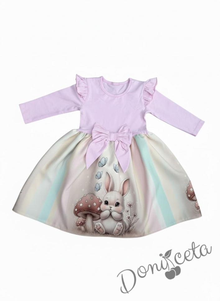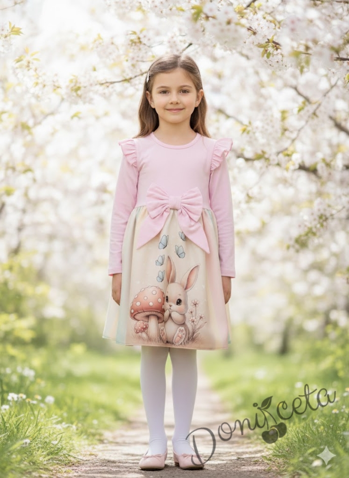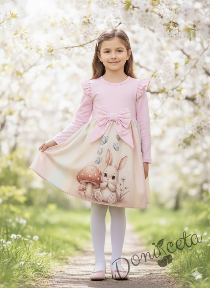 Бебешка/детска рокля в розово с къдрички, панделка и зайче