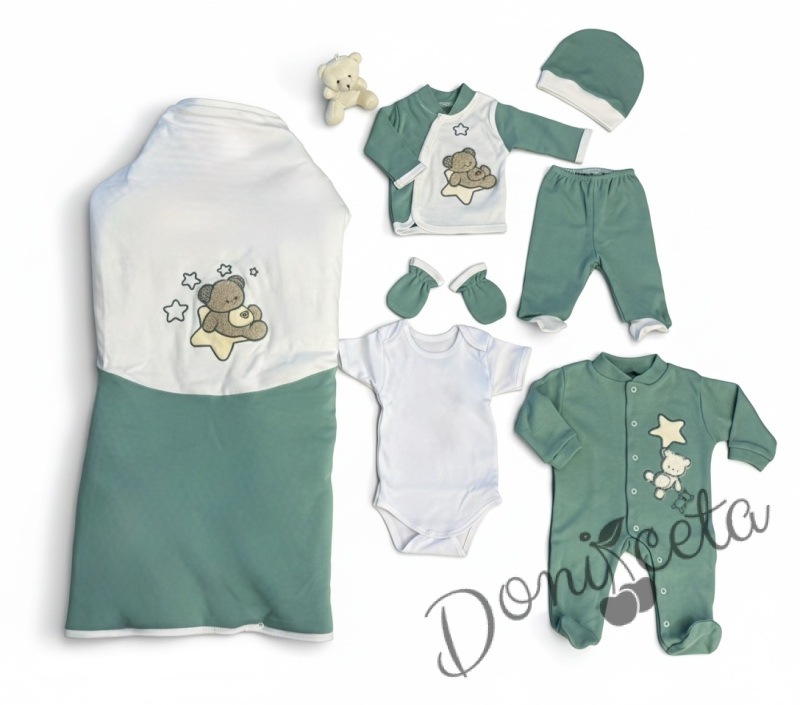 Бебешки комплект за изписване за момче в зелено и бяло от 7 части