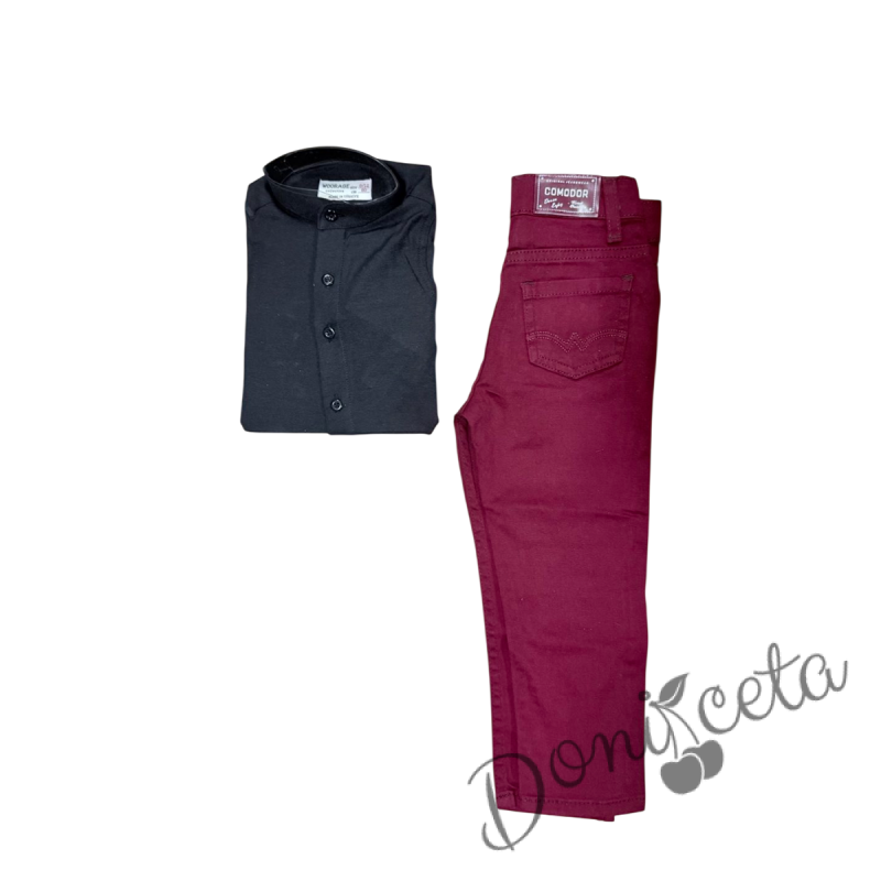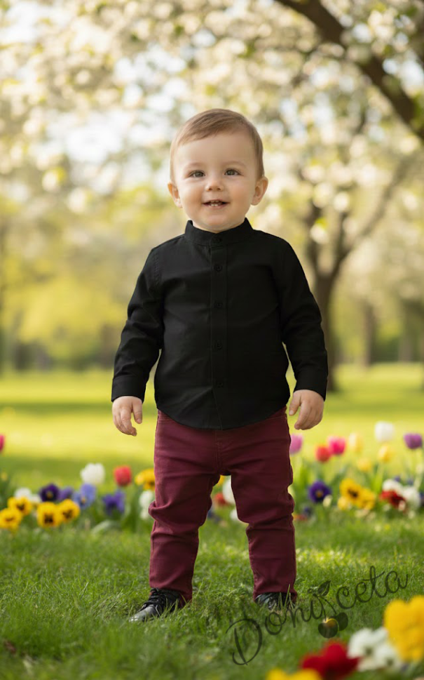 Официален комплект за момче от 2 части-риза в черно БЕЗ яка и панталон в бордо