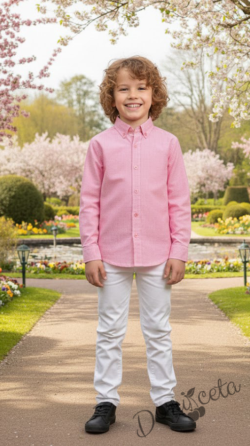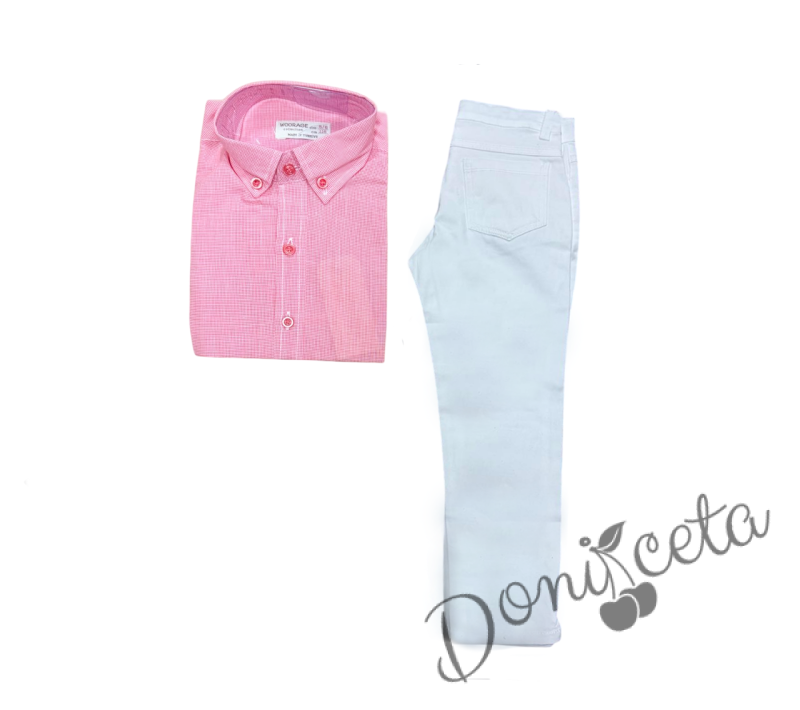 Комплект за момче от 2 части-риза в цвят корал с якичка и панталон в бяло