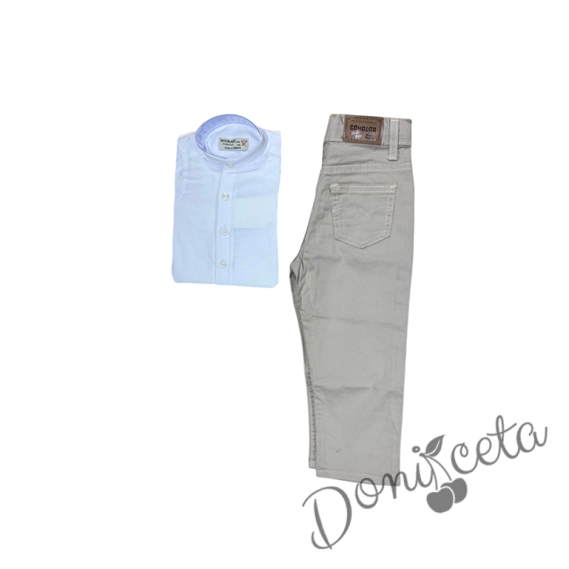 Детски комплект за момче от 2 части-риза в бял цвят и бежов панталон