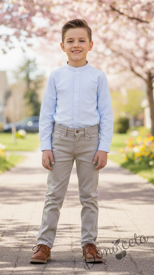 Представяме Ви нашия елегантен и стилен празничен комплект за момче от 2 части- риза в бяло без яка и панталони в бежово.