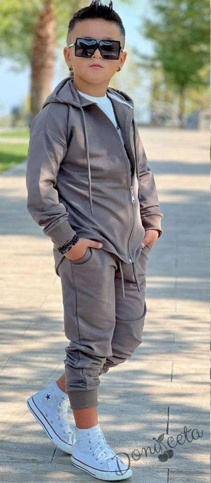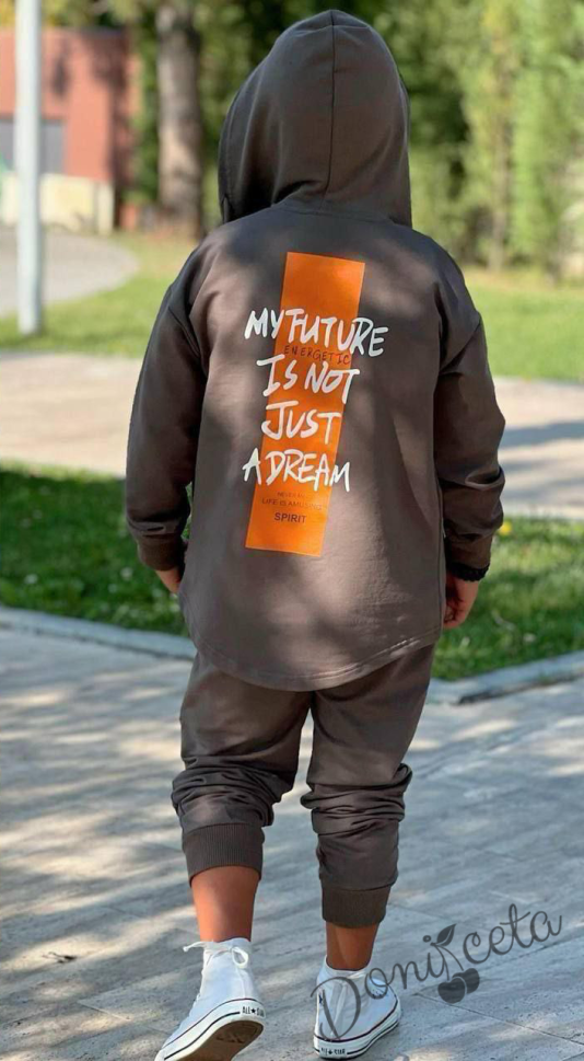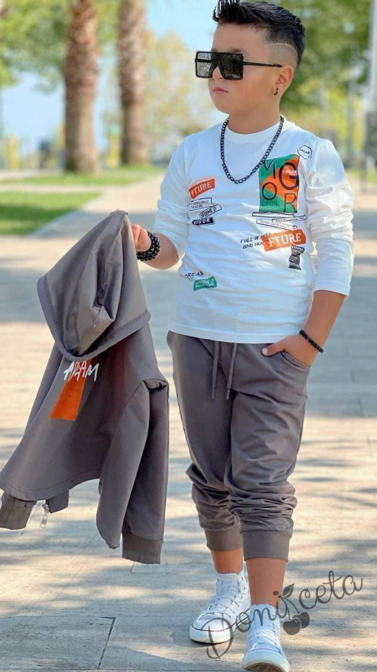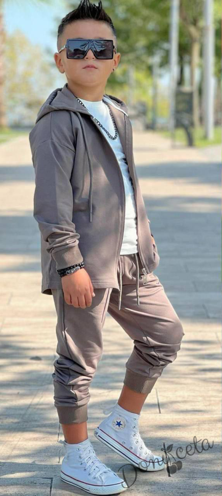 Детски спортен комплект за момче от 3 части- суитшърт в кафяво с връзки и надпис на гърба, блуза в бяло с надпис и долнище в кафяво