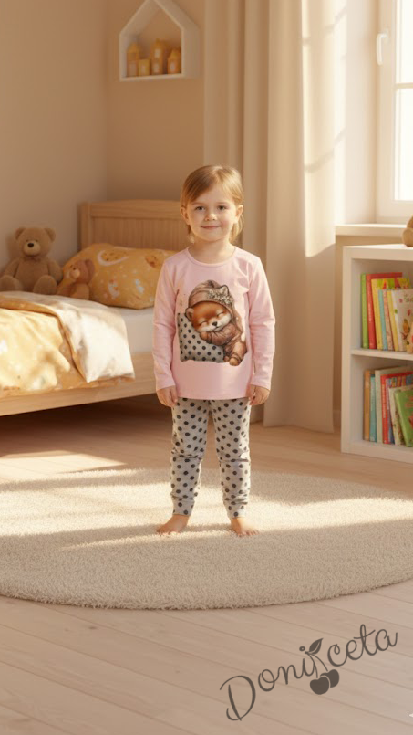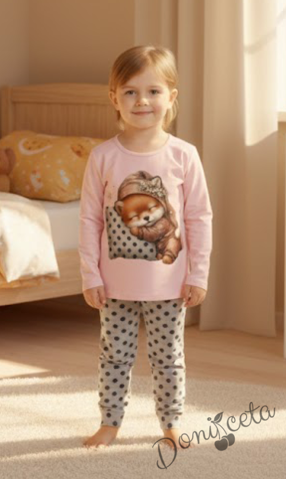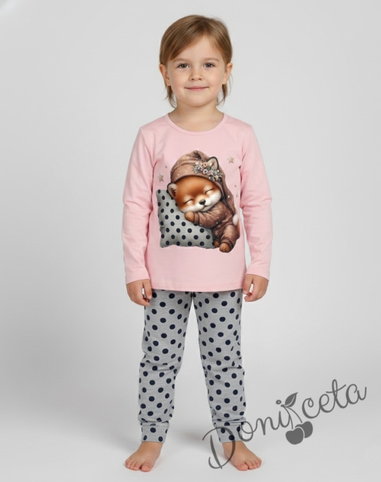 • Много сладка пижама за момиче с горна част от 100% памук в розово с картинка на лисичка, и долна част от памук и ликра в сиво на точки