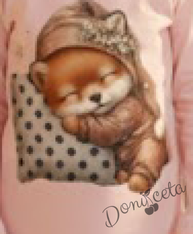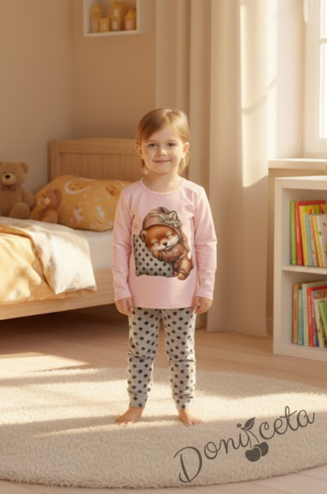 Детска пижама за момиче с горна част в розово с картинка и долнище в сиво на точки