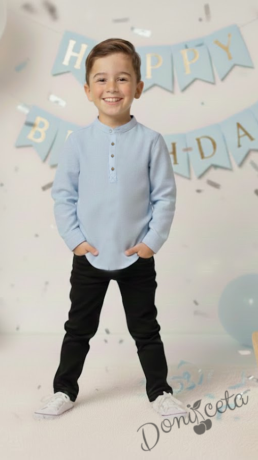 Представяме Ви нашия елегантен и стилен празничен комплект за момче от 2 части- риза в светлосиньо без яка и панталони в черно. Комплектът е подходящ за специални поводи както и за ежедневие.