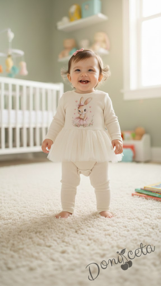 Бебешки рипсен комплект от 2 части- боди в екрю с тюл и картинка зайче и панталонки в екрю