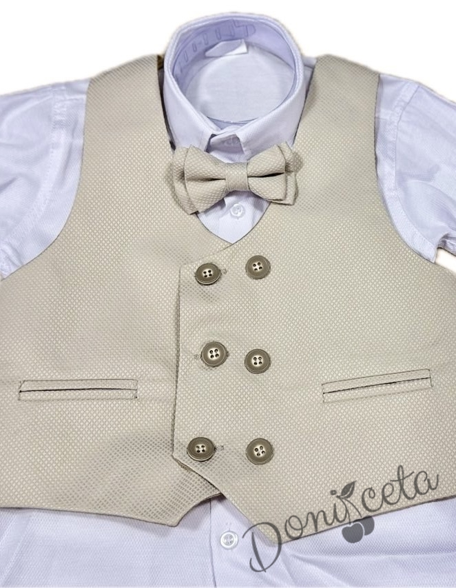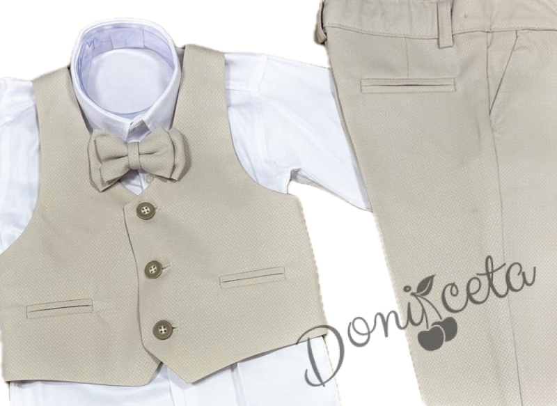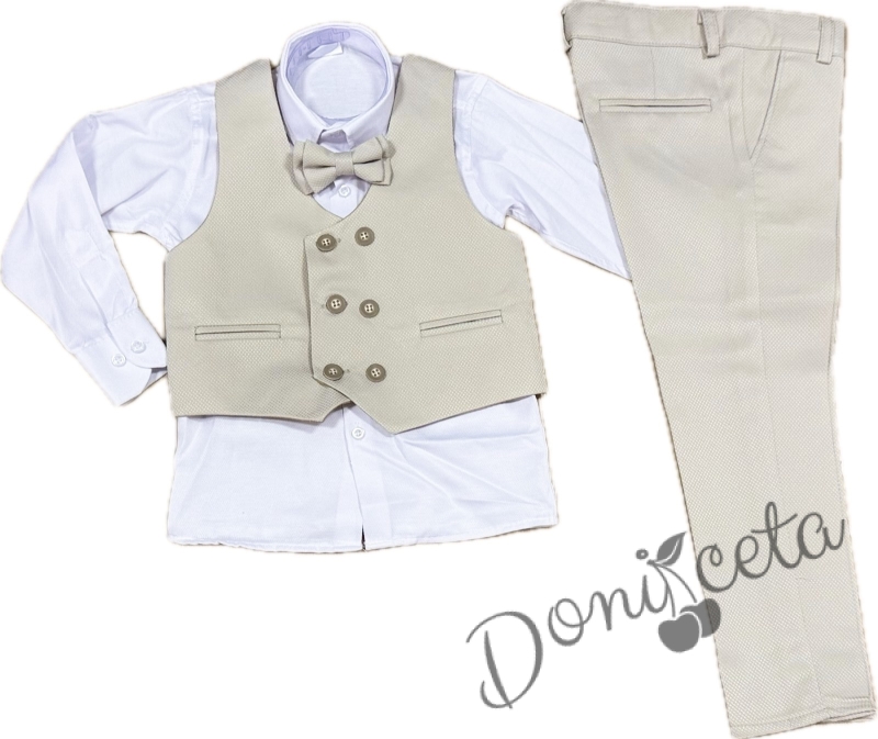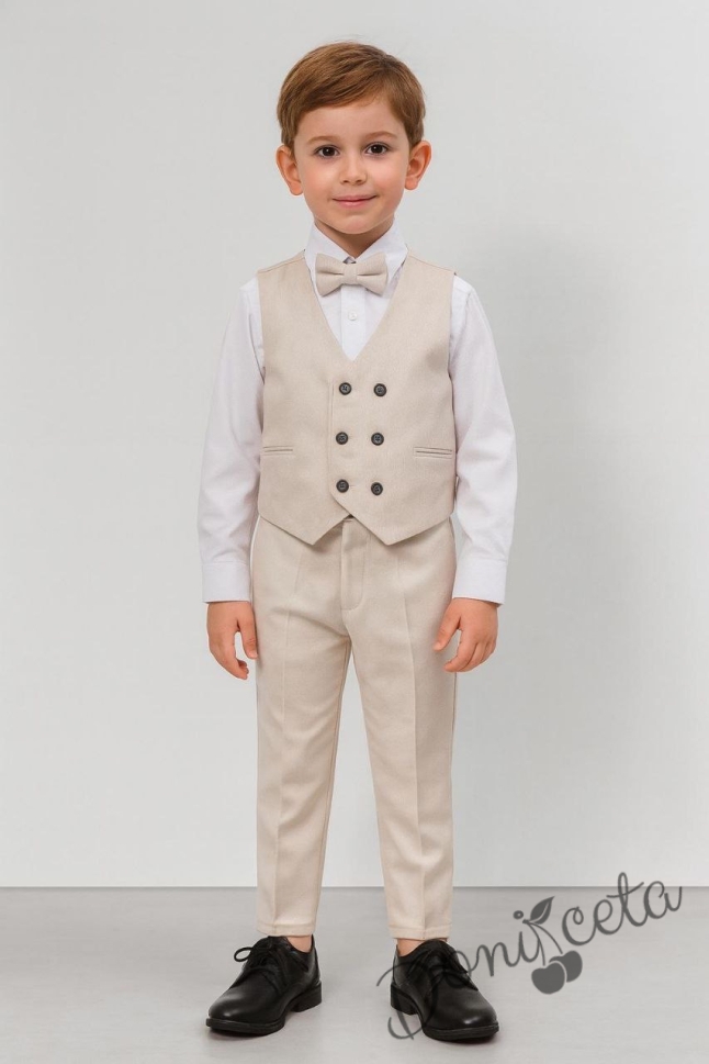 Елегантен костюм в бежово за момче от 4 части елек с два реда копчета, риза в бяло, панталон и папийонка от колекция Бежина