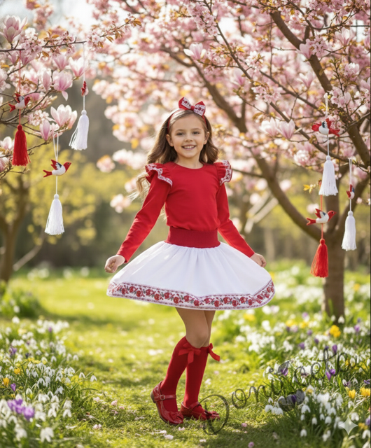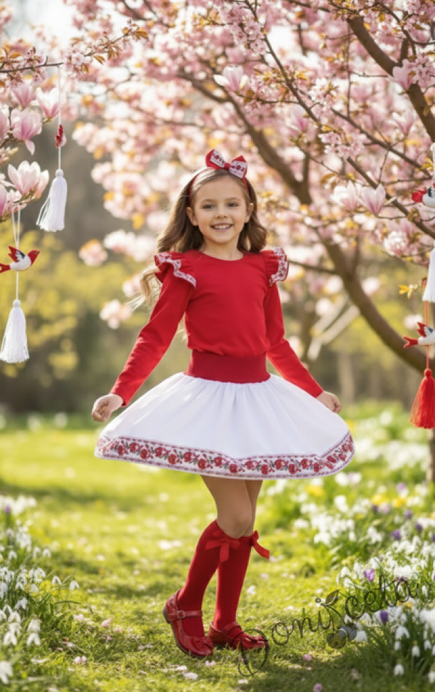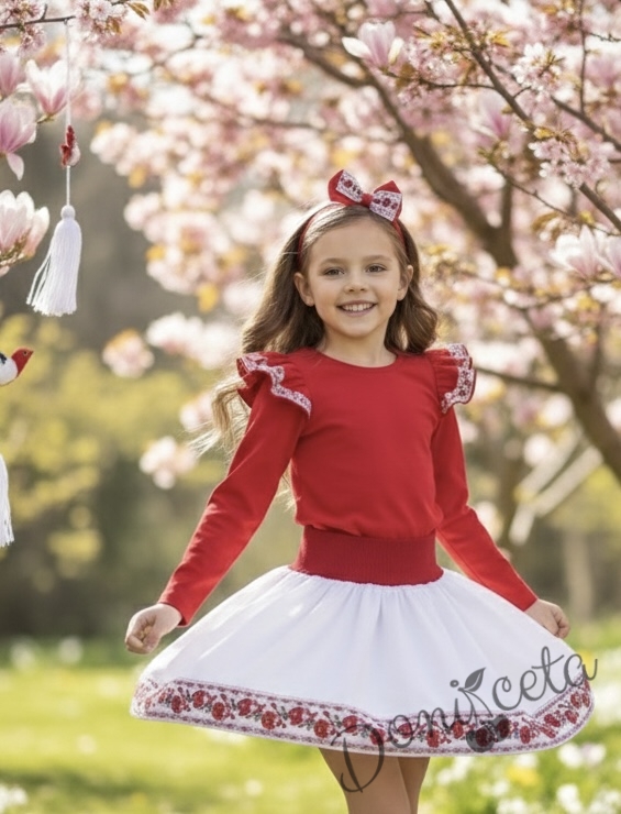 Комплект за момиче за баба Марта от 4 части-пола в бяло, блуза в червено с къдрици с фолклорни/етно мотиви, чорапи в червено с панделка с етно мотиви и диадема